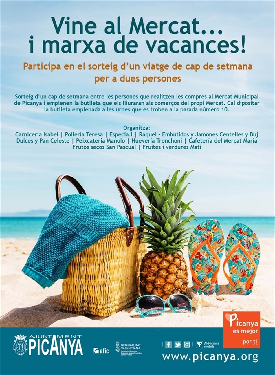 Els i les comerciants del Mercat Muncipal, amb el suport de l'Ajuntament, han organitzat un sorteig d’un cap de setmana entre les persones que realitzen les compres al Mercat. Per a participar sols cal emplenar la butlleta que els lliuraran als comerços del propi Mercat i dipositar la butlleta emplenada a les urnes que es troben a la parada número 10.