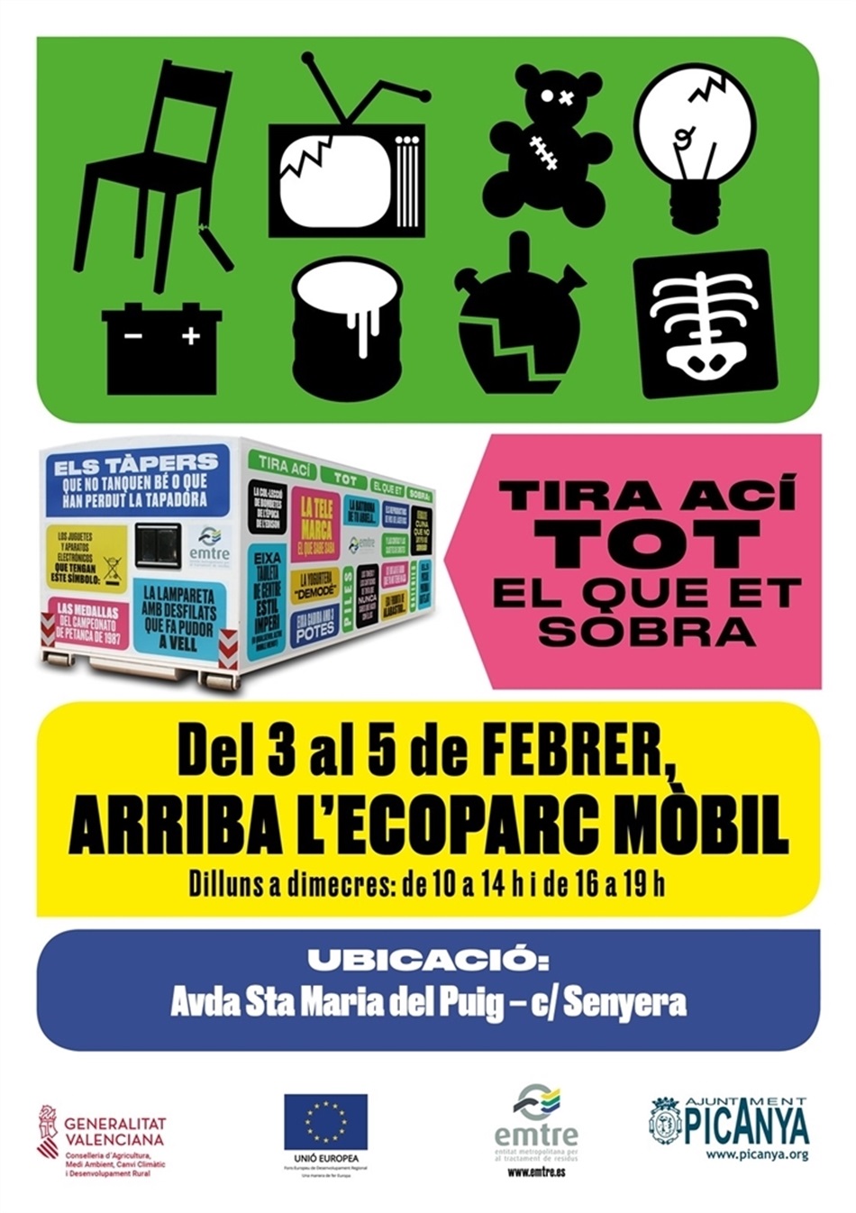 Des de hui dilluns 3 de febrer i fins al dia 5 a la ubicació d'Av. Sta. M. del Puig romandrà instal·lat un Eco-Parc móbil. L'objectiu d'aquest Eco-Parc mòbil és facilitar la recollida selectiva (i posterior tractament) d'aquells residus que no tenen un contenidor específic al nostre poble. Horari de 10.00 a 14.00h i de 16.00 a 19.00h.