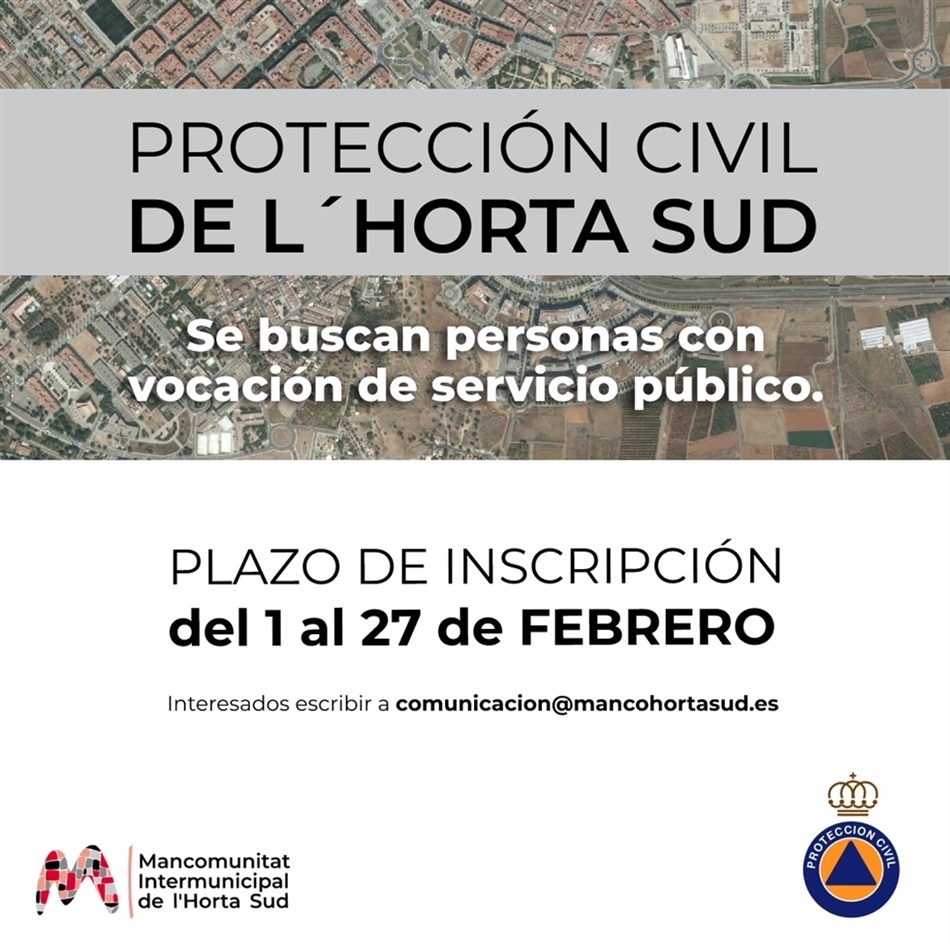 Fins al 27 de febrer està obert el termini per a la inscripció del perasonal voluntari. Les persones interessades hauran d'enviar un correu electrònic a l'adreça comunicacion@mancohortasud.es amb les seues dades personals, forma de contacte i una xicoteta carta de motivació. Una vegada rebudes les candidatures es farà una selecció per a crear un equip que puga rebre la formació corresponent abans de crear la unitat ja definitiva. En l'assumpte del correu posa Protecció Civil Horta Sud.