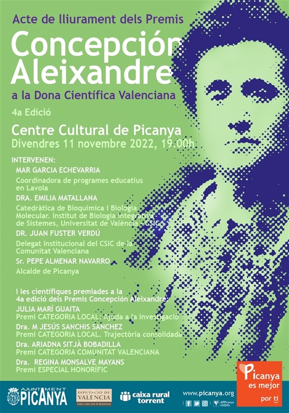Este proper divendres 11 de novembre (19.00h) el Centre Cultural de Picanya acull l'acte de lliurament de la 4a edició dels premis Concepción Aleixandre a la dona científica valenciana. Estos premis, convocats per l'Ajuntament de Picanya tenen com a objectiu premiar la contribució de la dona valenciana en el desenvolupament de la ciència i motivar les dones de Picanya en l’estudi i investigació de les ciències.