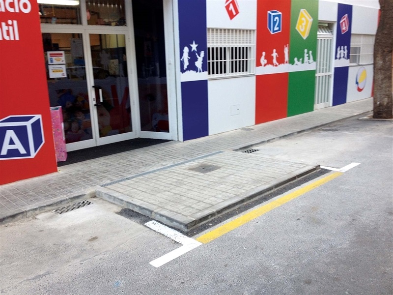 Així davant de les dues escoletes infantils dels carrers P. Sang i Verge de Monserrat (les conegudes com a “les monges” i “el Cuquet”) es procedeix a ampliar la vorera, tot i eliminant l’aparcament just davant la porta, i instal·lant un banc que permeta l’espera i també faça de tanca limitadora.