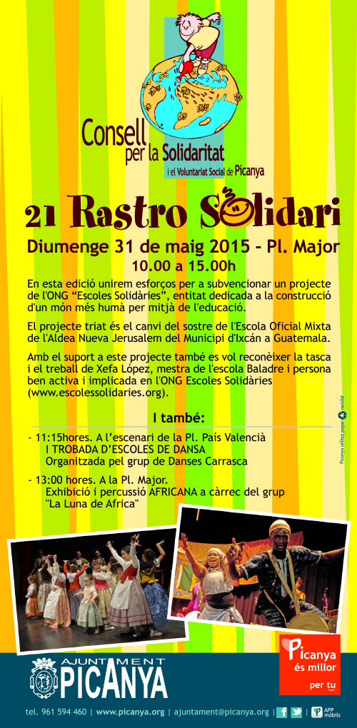 Com en anys anteriors el Rastro Solidari també tindrà el seu vessant cultural i així, a les 11:15hores. A l’escenari de la Pl. País Valencià podrem disfrutar de la 1a TROBADA D’ESCOLES DE DANSA organitzada pel grup de Danses Carrasca i a les 13:00hs a la Pl. Major serà el torn de l'exhibició de danses i percussió AFRICANA a càrrec del grup "La Luna de Africa".